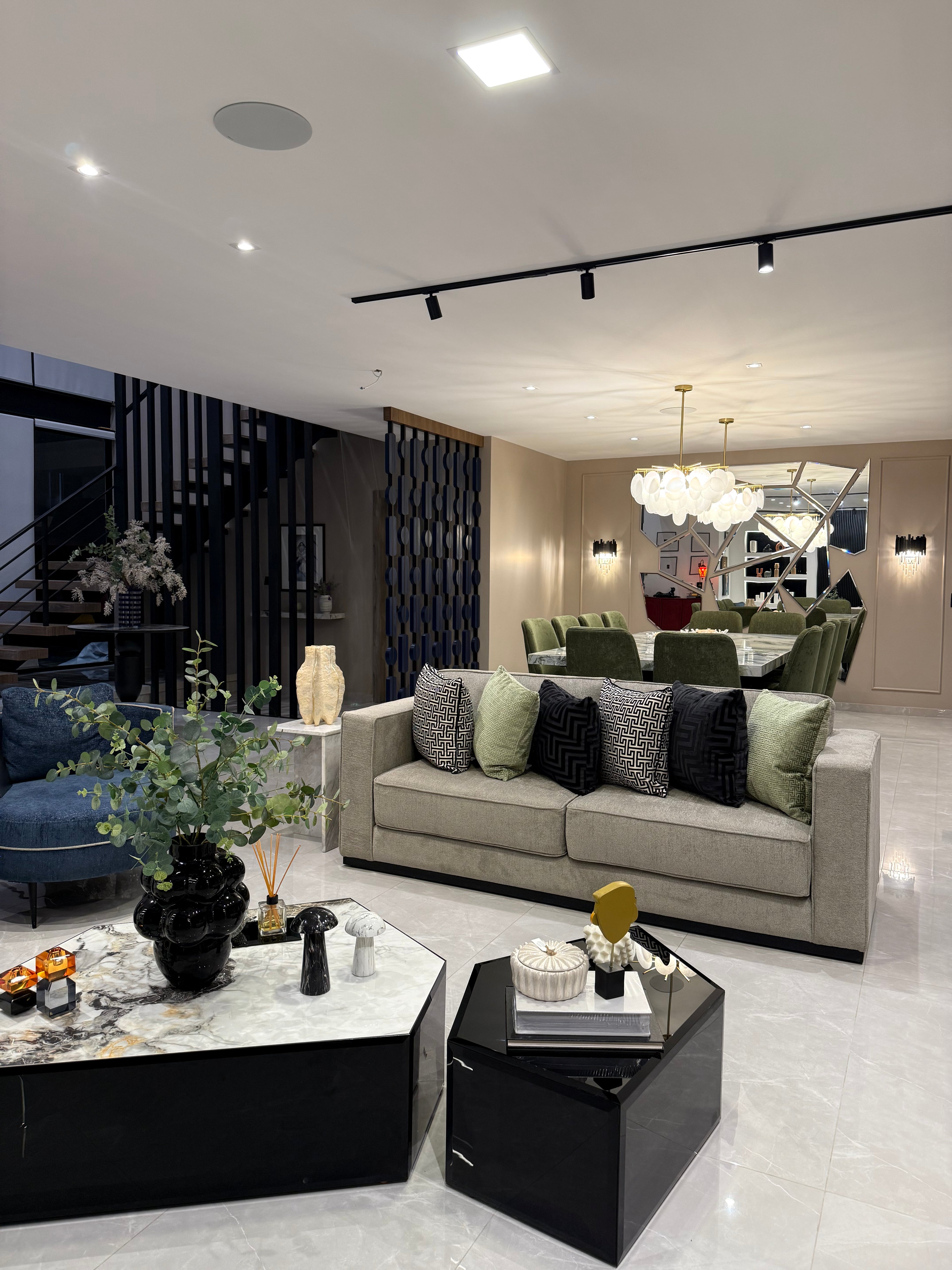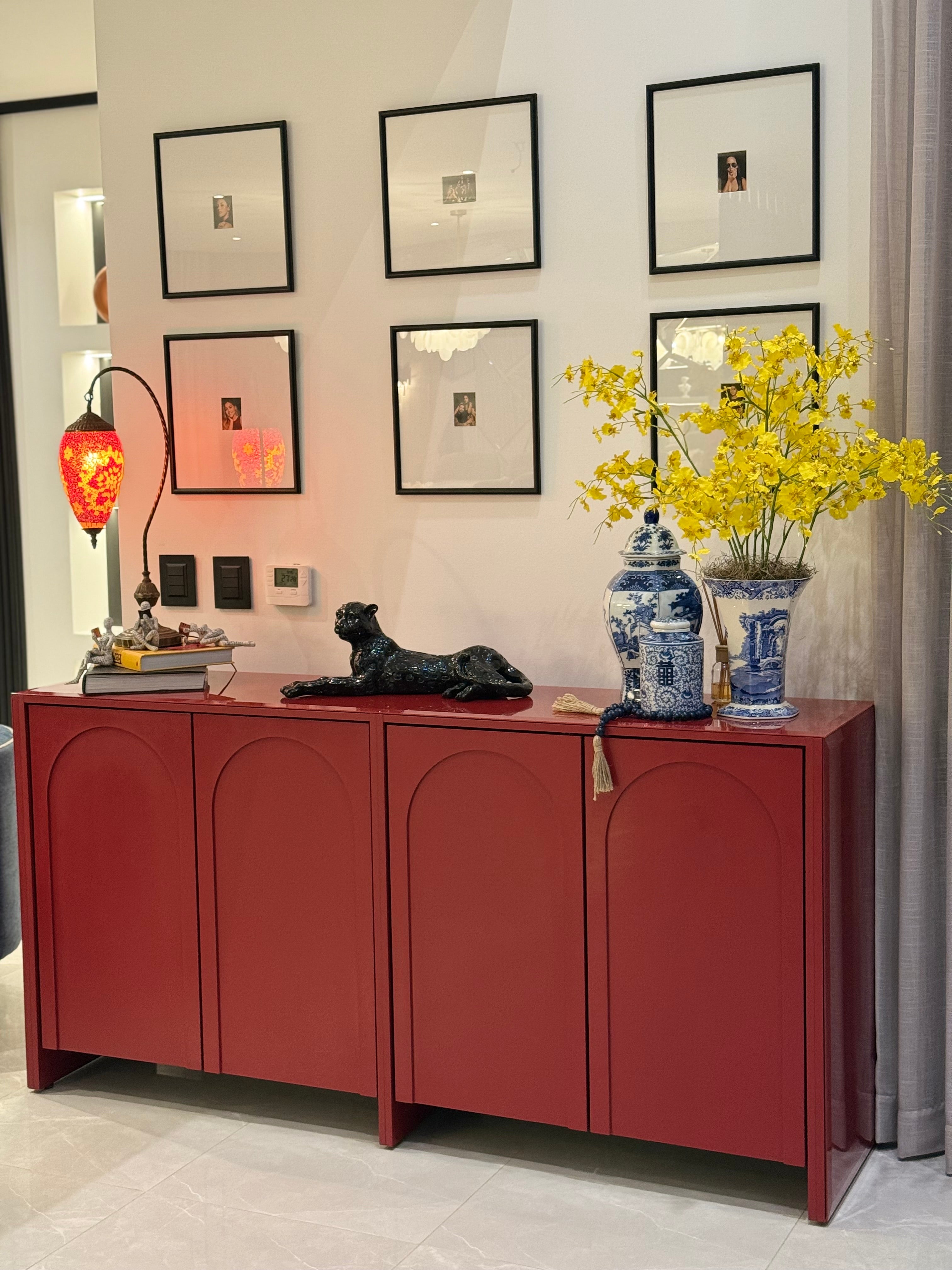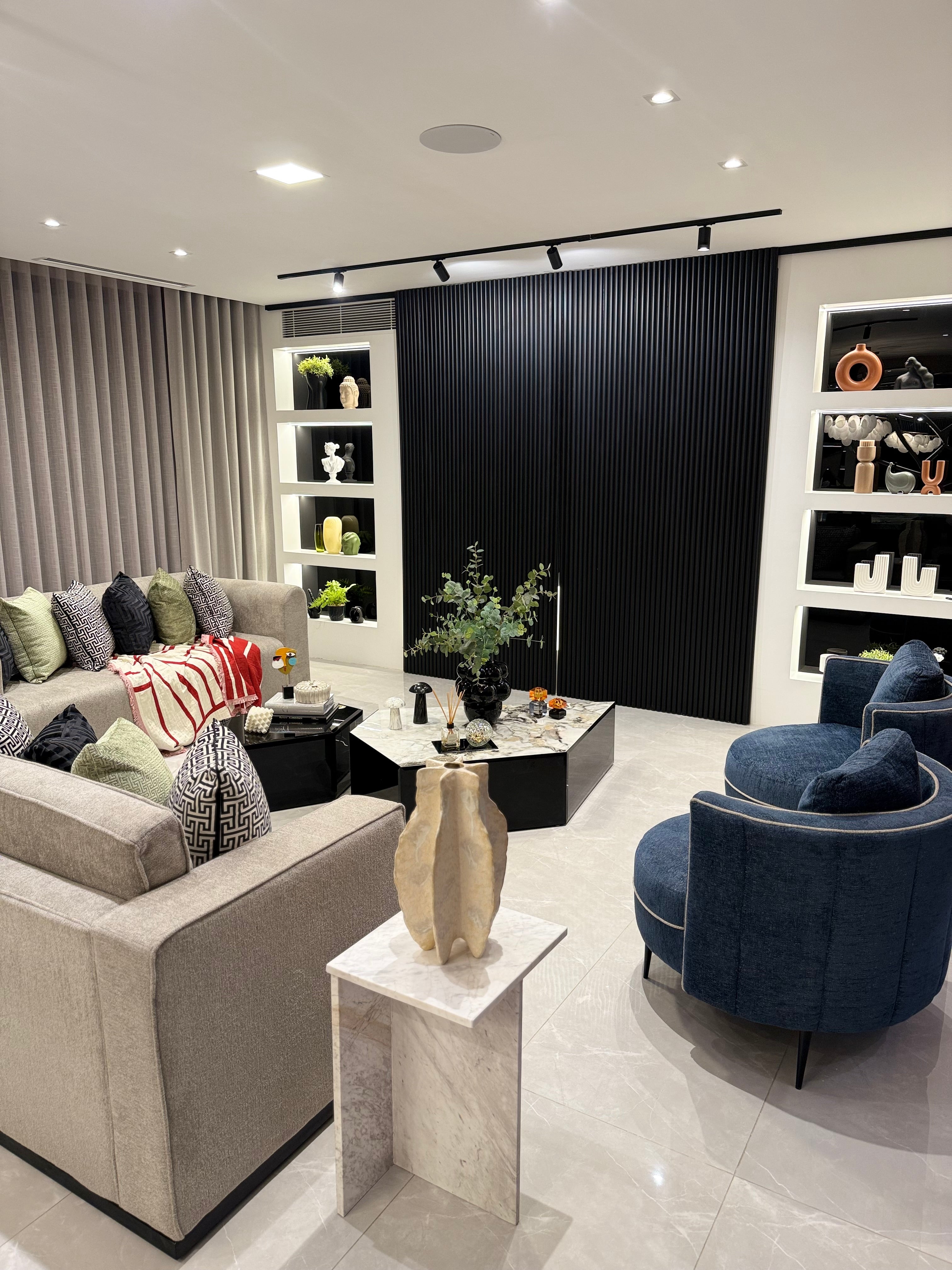 Diseñamos esta sala de estar y comedor pensando en el equilibrio entre confort y estética. La paleta combina blancos luminosos con azules en los muebles secundarios, acentos rojos que aportan calidez y texturas que añaden profundidad. Ambos espacios se integran de forma natural en el espacio, creando un ambiente pensado tanto para el día a día como para disfrutar de una experiencia de sofisticación en casa, sin perder la sensación de hogar.